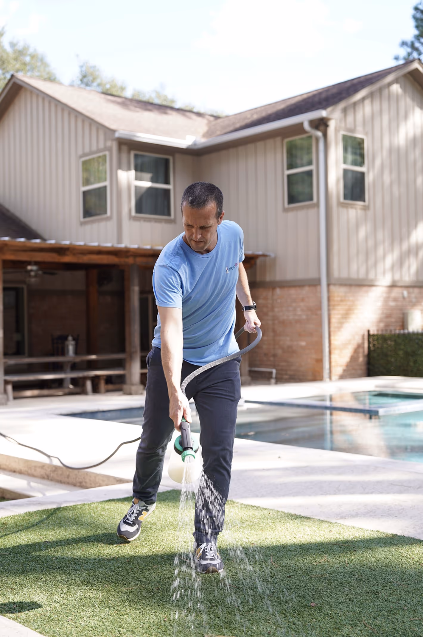 We attach our hose to your water spigot and use our sanitizer applicator to spray your grass, turf, patio, or deck. Our all-natural formula contains an oxidizing agent that quickly breaks down odor-causing compounds in pet waste, effectively removing the foul smell.